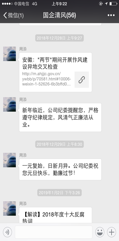 ▲通過微信、短信平臺發(fā)送元旦春節(jié)廉政短信,送出新年祝福的同時也送出了廉政提醒