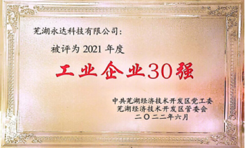 2022年6月9日下午,在蕪湖經(jīng)濟(jì)技術(shù)開發(fā)區(qū)管委會(huì)一樓多功能廳,蕪湖永達(dá)科技有限公司在“蕪湖經(jīng)濟(jì)技術(shù)發(fā)開區(qū)2022年度企業(yè)發(fā)展大會(huì)”上,榮獲“蕪湖經(jīng)濟(jì)技術(shù)開發(fā)區(qū)2021年度工業(yè)企業(yè)30強(qiáng)”榮譽(yù)稱號(hào)。