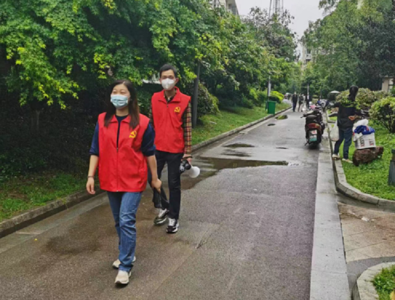 黨員志愿者在社區(qū)內巡邏,向社區(qū)居民宣傳疫情防控知識,及時發(fā)現(xiàn)和堵塞防控漏洞。
