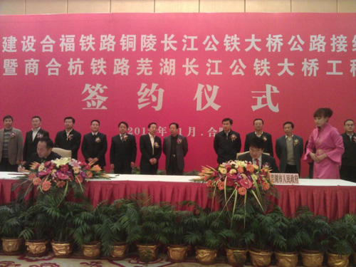 在簽約儀式上,省投資集團公司分別與蕪湖市政府、銅陵市政府簽訂了“合作建設(shè)合福鐵路銅陵長江公鐵大橋公路接線工程和商合杭鐵路蕪湖長江公鐵大橋工程”框架協(xié)議;省投資集團公司分別與蕪湖市交投公司和銅陵市交投公司簽署“合作建設(shè)合福鐵路銅陵長江公鐵大橋公路接線工程合同書”。兩項投資協(xié)議的簽署標志著商合杭鐵路蕪湖長江公鐵大橋、合福鐵路銅陵長江公鐵大橋公路接線工程兩個項目公司正式成立運作,對我市實施擁江發(fā)展具有重大的戰(zhàn)略意義。